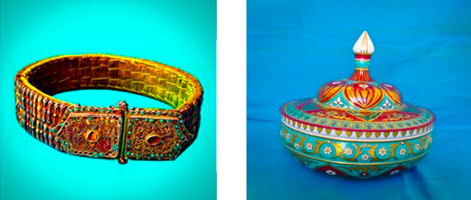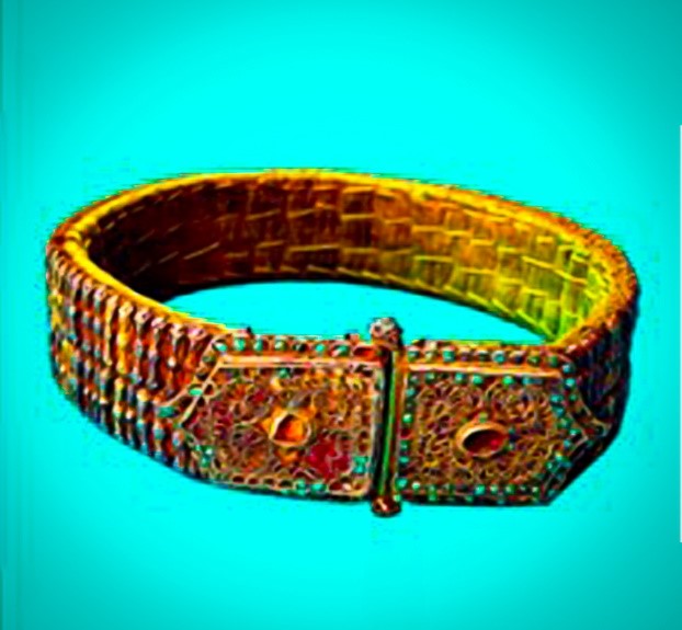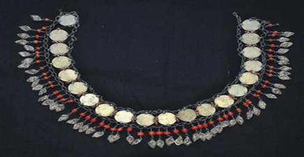 ![]() | Tahya tuzi ayollar boshi bezagi. U gumbazsimon dumaloq kumush plastinkadan iborat. Ustki qismida to‘rtta yoqut, to‘rtta pushti rangli tosh qadalgan, barcha toshlar atrofi feruza bilan o‘ralgan. Butun atrofi bo’ylab marjon va tilla suvi yuritilgan kumush yaproqchalar ulangan. 1 - dona. O’lchami: Og‘irligi - 442,9 gr. |