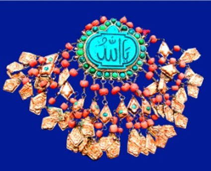 ![]() | “Duo tuzi” - ayollar taqinchoqlari. Kumush plastinkadan iborat. Medalyondan oval shakldagi ko‘k figurali tosh, o‘rtasida arabcha “Yo Alloh” yozuvi bor, feruza va marjonlar bilan bezatilgan. Taqinchoqning past qismi atrofiga ikki qatior qilib terib tilla suvi yuritilgan kumush yaproqchalari bor. 1-dona. O‘lchami: 50х110 mm. |
