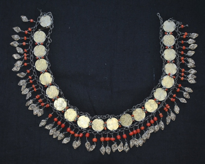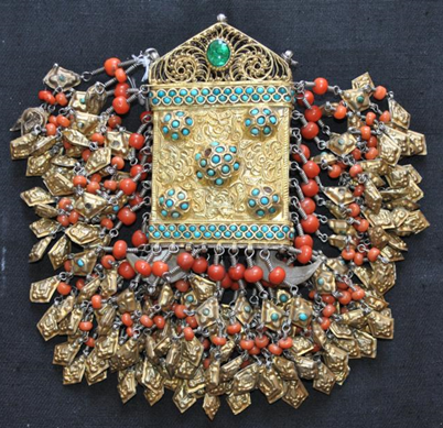 ![]() | Butun tirnoq ayollar bosh bezaklari. Mayda simlar bezak qilib to‘qilgan, tilla suv yuritilgan to‘rtburchak kumush plastinaning to‘rt burchagi va o‘rta qismida bo‘rtma qilib ishlangan feruza toshli bezaklari bor. Pastki qismi uch tomoniga marjon va tilla suvi yuritilgan kumush yaproqchalar ulangan.1 - dona. O‘lchami: Og‘irligi - 283,6 gr. |